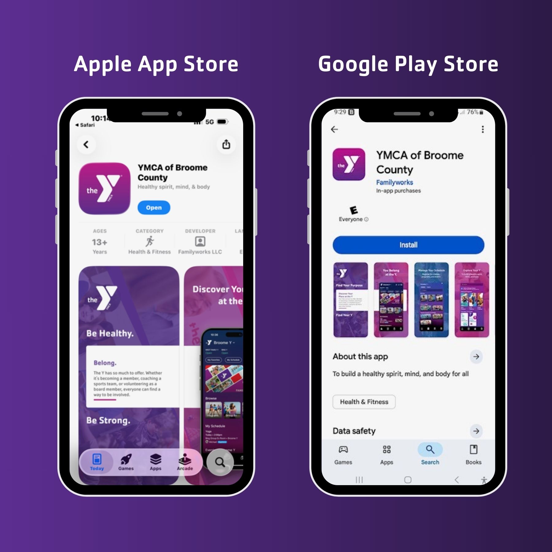 The YMCA of Broome County app is available in the Apple App Store and the Google Play Store. Download now using the buttons below or search for "YMCA of Broome County" and find the purple app cover pictured.